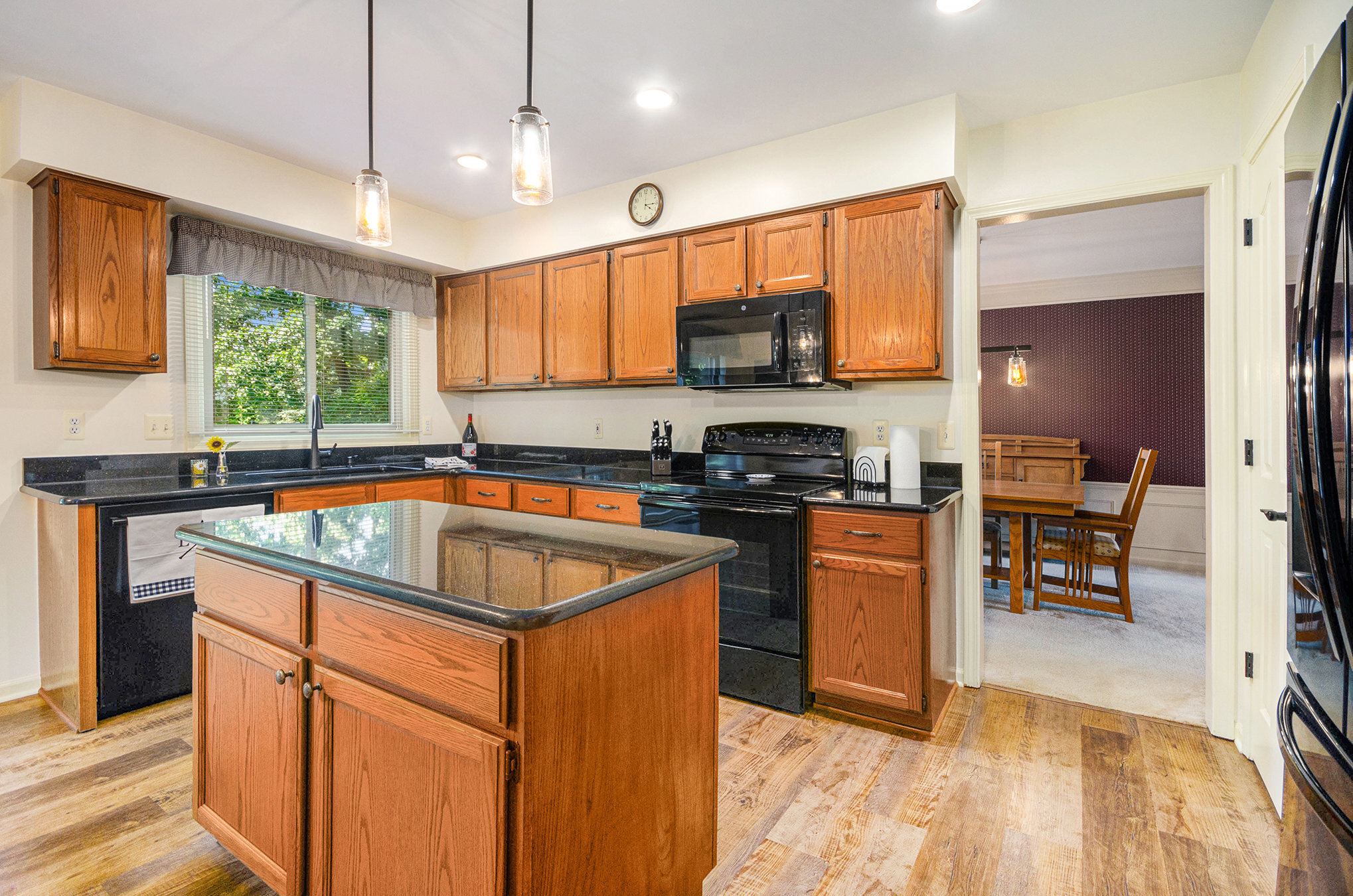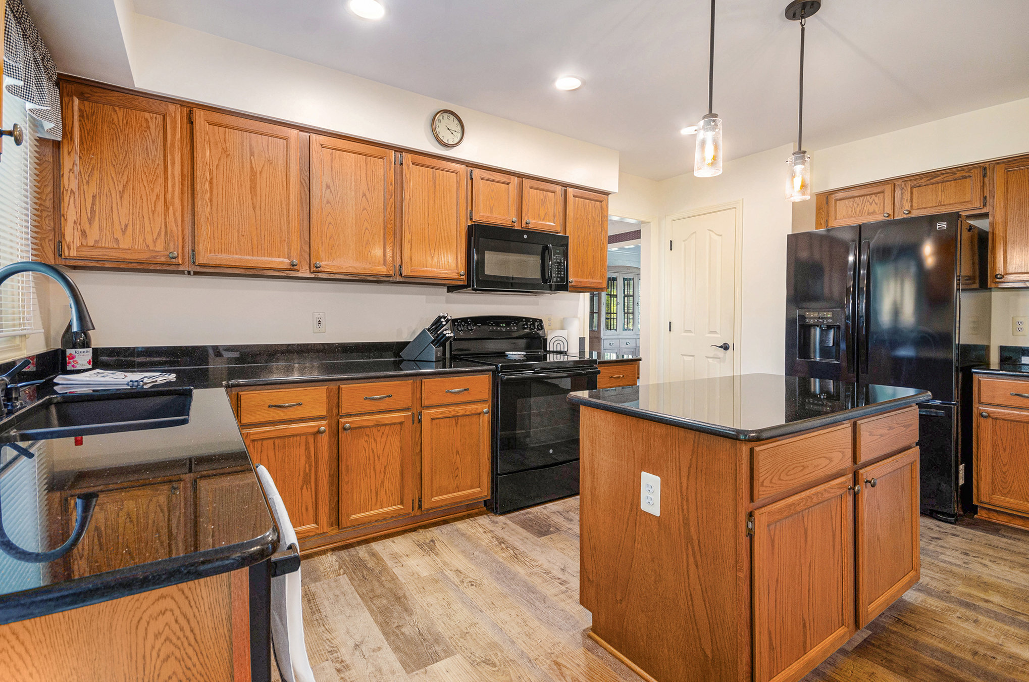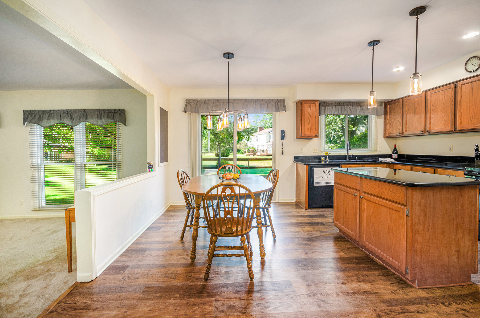 The entry opens to a spacious layout, featuring a living room with a bay window that allows in loads of natural sunlight. The dining room features a new chandelier fixture and custom wainscoting, and the beautiful shaker dining set can stay! The generously sized kitchen offers ample cabinet and granite counter space, a prep island, new modern light fixtures, beautiful luxury plank flooring, and a spacious dining area. A door wall leads to the spacious deck and a beautifully landscaped backyard. The large family room features a cozy gas fireplace, views of the ample backyard, and plenty of furniture placement options.