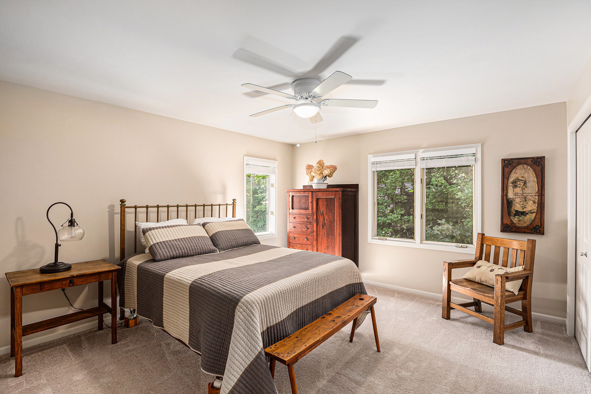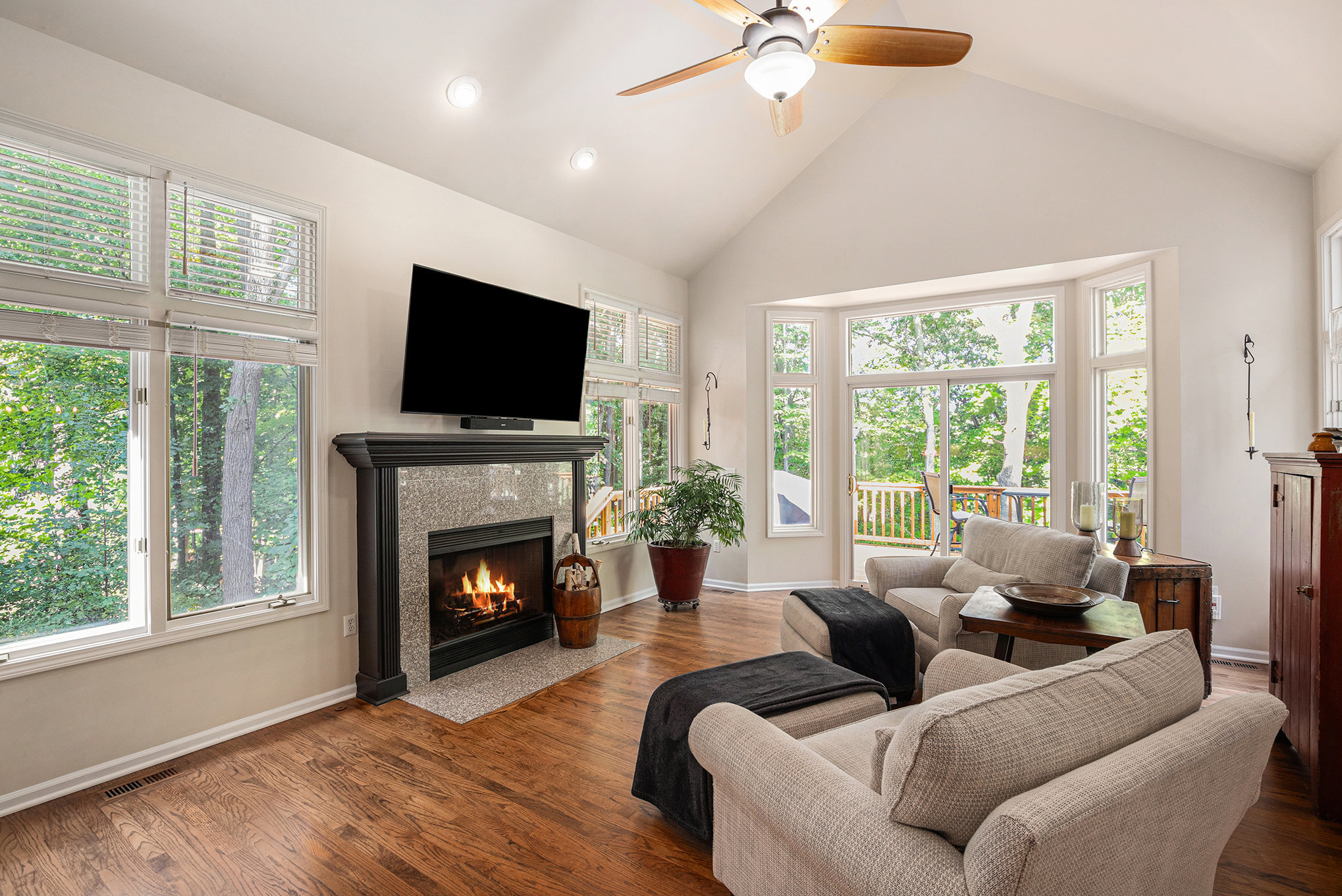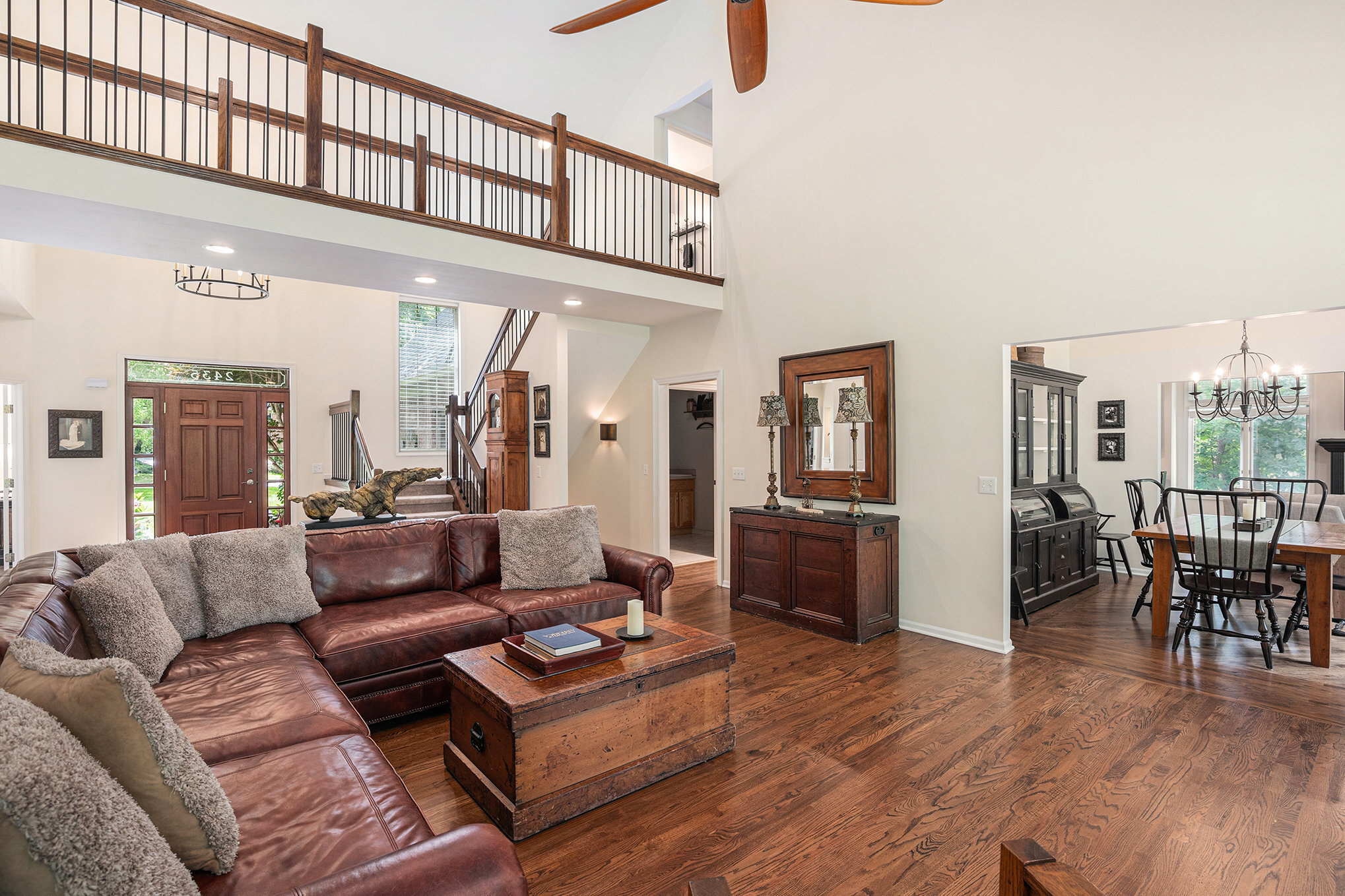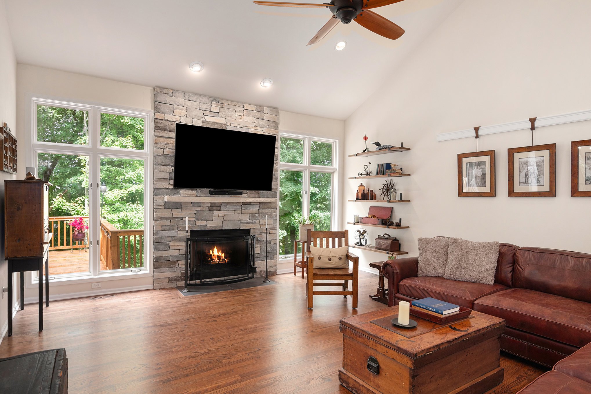 Thoughtfully designed, this home offers year-round views of the tranquil woods and nature from nearly every room. Gorgeous hardwood floors grace the main level, while a dramatic great room showcases soaring vaulted ceilings, and a pair of floor-to-ceiling windows frames the stone fireplace and presents sweeping views of nature.
