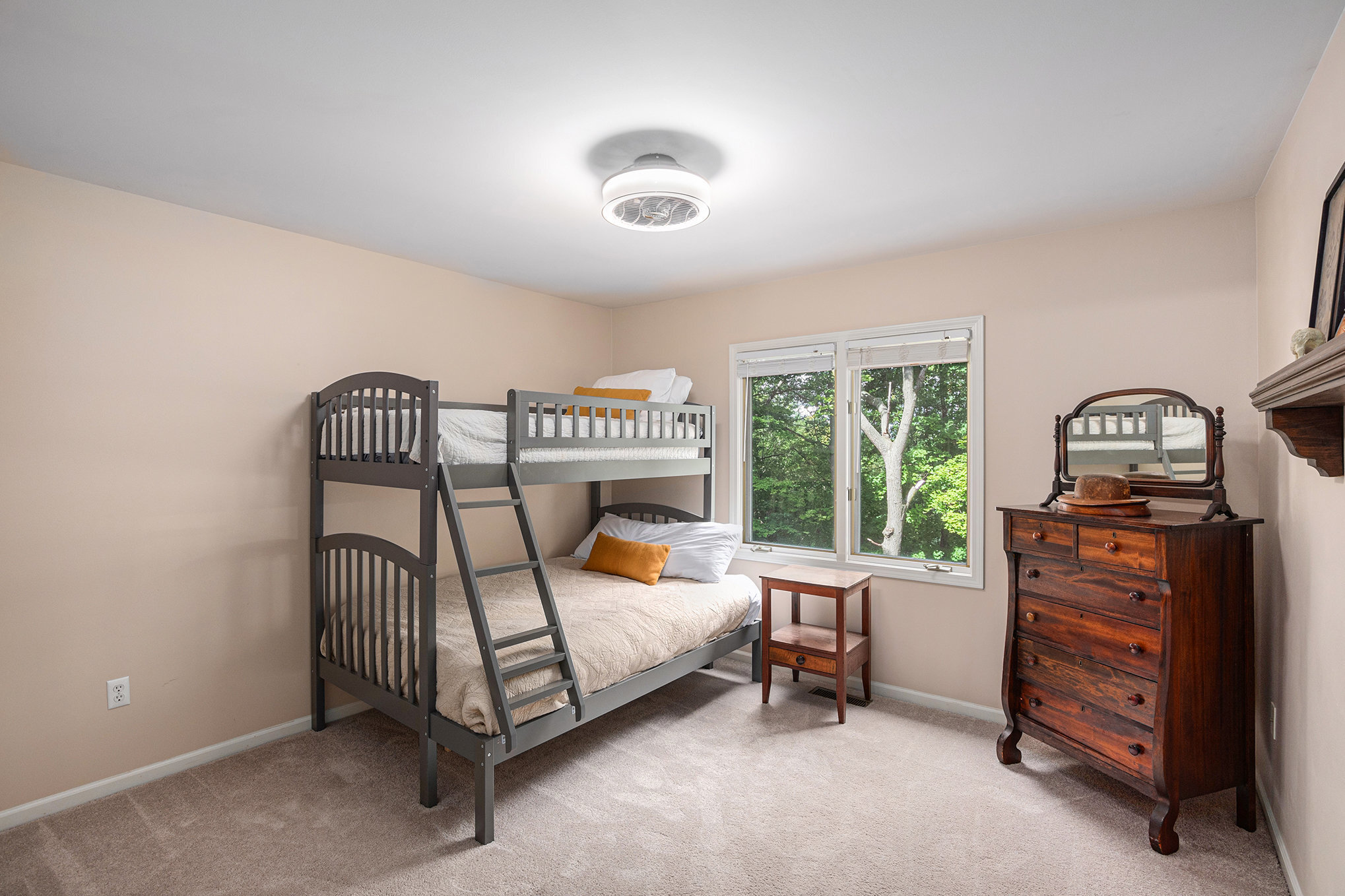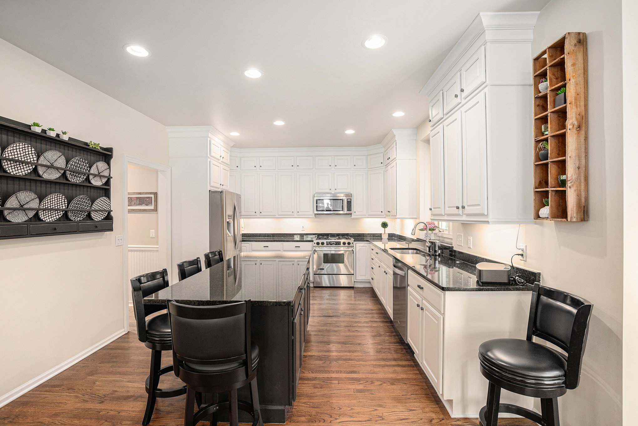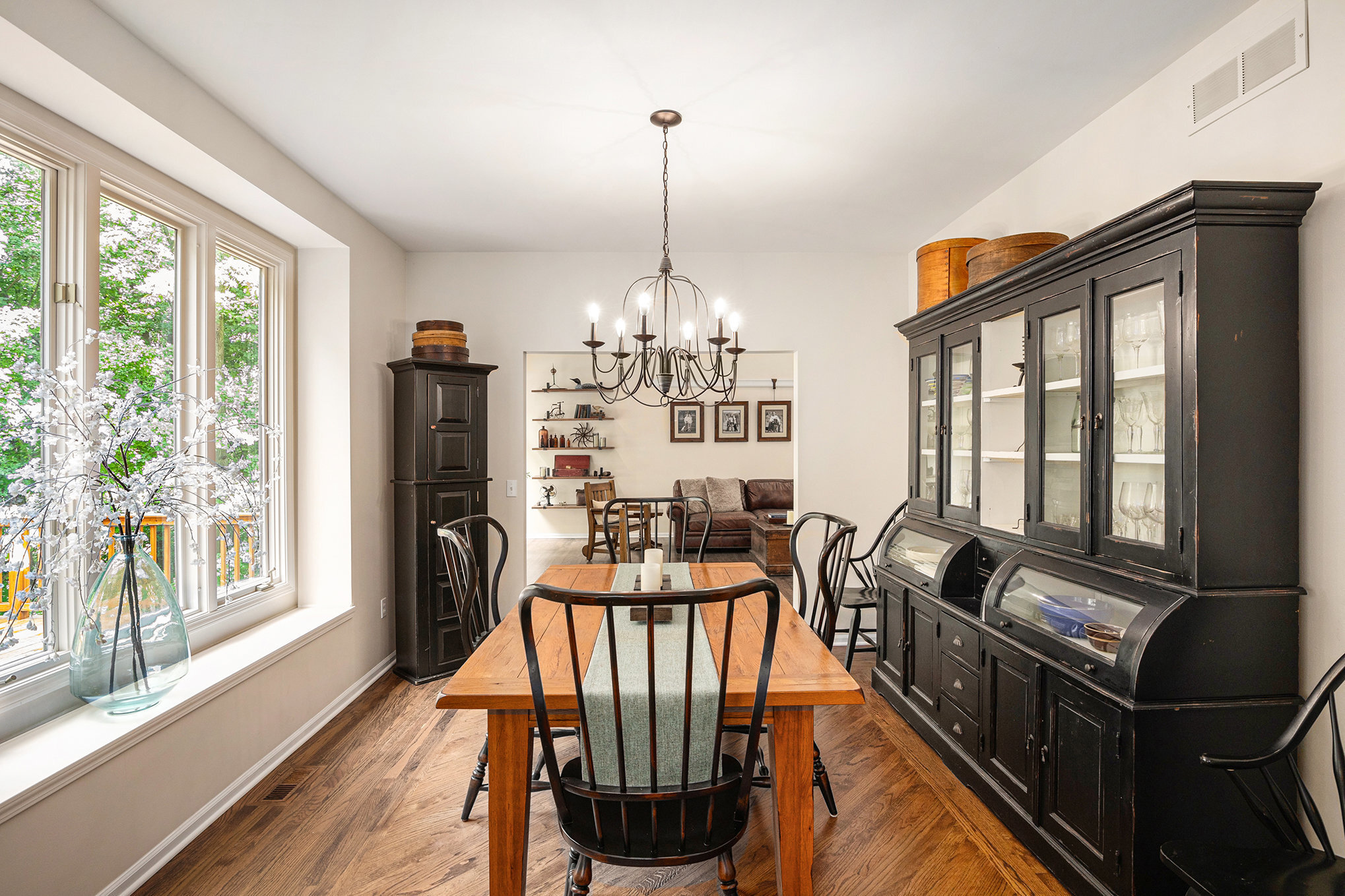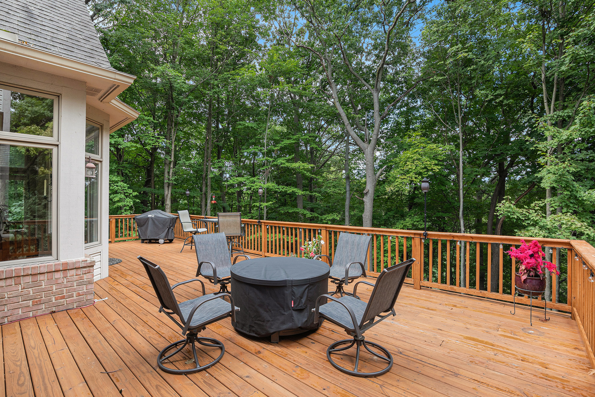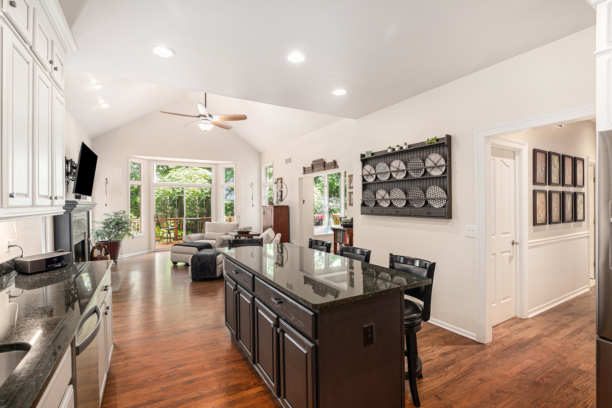 The kitchen is a chef’s dream, featuring an abundance of cabinetry, granite countertops, a spacious island with bar seating, and a fabulous walk-in pantry. Adjacent to the kitchen and dining room, the breakfast room flexes as a cozy sitting area and features a bayed door wall to a new deck with tree-top views.